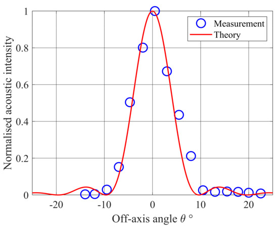 where x = kdsin(θ)/2 for beam angle θ and k is the wavenumber [20]. The squared term has a half-power half-width of approximately Mx = 21/2. The angular behavior of an individual speaker is described by I0(θ) which for these speakers and frequencies is approximately proportional to cos4(θ). Based on (A1) the array gave a directional beam of half-power angular width of 6° at 2.5 kHz and 4° at 4 kHz which agrees closely with the measured response, as shown in Figure 2.