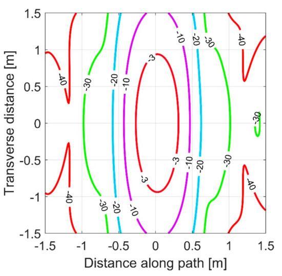 The 2D intensity pattern on the ground can be calculated by summing the transmitted waves from each speaker allowing for distances (and correct phase) and for spherical spreading of the power. Assuming omnidirectional reflection from a diffusely reflecting surface, the power reaching each microphone can then be calculated, again allowing for distances and spherical spreading. Figure 4 shows the resulting predicted footprint sensitivity for recorded intensity, at a frequency of 3.4 kHz, with h = 2 m and with 6 speakers per array. The half-power width is 0.5 m along the direction between transmitter and receiver, and 2 m in the transverse direction. The sensitivity falls off rapidly from the central plateau.