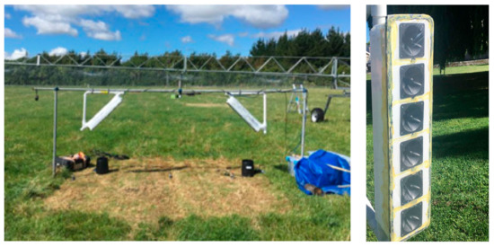 From Figure 1, the greatest fractional variation is predicted to occur at the higher frequencies. Therefore, an acoustic frequency of 2.5 to 4.5 kHz was chosen for the design. An array of six speakers, with their center-to-center distance 85 mm, were used to generate short pulses of duration 2 ms directed downward at an angle of 45°. This pulse duration was selected based on doing initial measurements in the laboratory and beneath an irrigator using the speakers and microphones mounted on a test rig of height 1 m above the ground and with the horizontal separation between array centers being 2 m (see Section 3.1 below). For this geometry, and for angles of incidence and reflection at the ground being 45°, the time difference between direct (horizontal) reception and slantwise reflected reception is 2.4 ms for a sound speed of 340 m s−1. The pulses comprised sinusoidal waves of 4 cycles at 2 kHz and 8 cycles at 4 kHz. This frequency range ensures a response due to porosity, without undue absorption from the air, soil, or any overlaying pasture. The Motorola KSN1005A super horn piezo tweeters were chosen, producing sound pressure levels of 74 dB at 2 kHz and 94 dB at 4 kHz, at 1 m distance when driven with 2.8 Vrms. The speakers have dimensions of d = 85 mm.