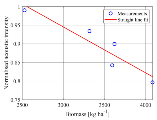 The ground impedance is known to depend on pasture coverage [14]. In order to evaluate the dependence of reflectivity on pasture cover, the frame shown in Figure 8 was mounted above three different areas of pasture. For each area, reflectance measurements were conducted over uncut pasture, pasture cut to mid-height, and pasture cut to close to the ground. Figure 10 shows results normalized to the “bare ground” intensities. The biomass dry matter was measured by collecting the cut pasture, drying it, and weighing. The biomass is given in kg per hectare in the figure caption.