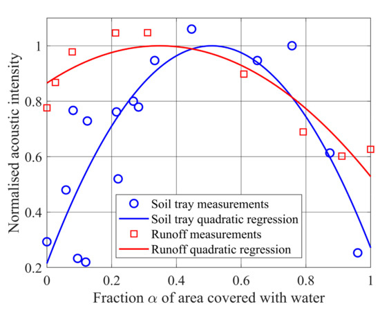 In the first set of experiments, the fraction α of the soil surface covered in water was estimated from 3D camera images [23,24] and compared with measured acoustic reflectance measured using pulses of frequency 2.5, 2.9, 3.3, 3.7, 4.1, and 4.5 kHz modulated as described above. Depressions were manually made in the soil surface and gradually filled with water. Figure 6 shows data from two different experiments. The first, shown in black, includes error bars calculated from the variation with frequency at each areal coverage. Results, when normalized to the maximum intensity at each frequency, were nearly independent of frequency. The curve in red on Figure 6 shows a much more extensive range of area coverage of water. The salient feature of these experiments is that there is a substantial, statistically significant, increase in reflectance up to a fractional cover of 40–60% and dropping off thereafter.
