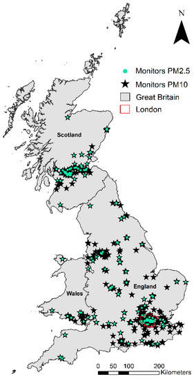 The World Health Organization estimates in seven million global deaths associated with air pollution (both outdoor and household) every year, emphasising that exposure to particulate matter (PM) is among the greatest causes of concern [1]. Fine particles with an aerodynamic diameter smaller than 2.5 µm (PM2.5) can penetrate the human circulatory system through the lungs and provoke multiple adverse health outcomes, including mortality [2], hospital admissions [3], lung dysfunction [4], cardiovascular diseases [5], and allergic reactions [6]. Usually, epidemiological studies collect air quality (AQ) data from ground monitors to quantify both short-term and long-term PM2.5 exposure associated with acute and chronic health effects, respectively. The limitation in this health assessment approach is the lack of continuous temporal records of PM2.5 and the limited spatial distribution of the monitors. Great Britain is an example of countries with very limited spatio-temporal coverage of PM2.5, whereby the monitoring network is densely located only in major cities and widespread measurements of PM2.5 only started from 2010.