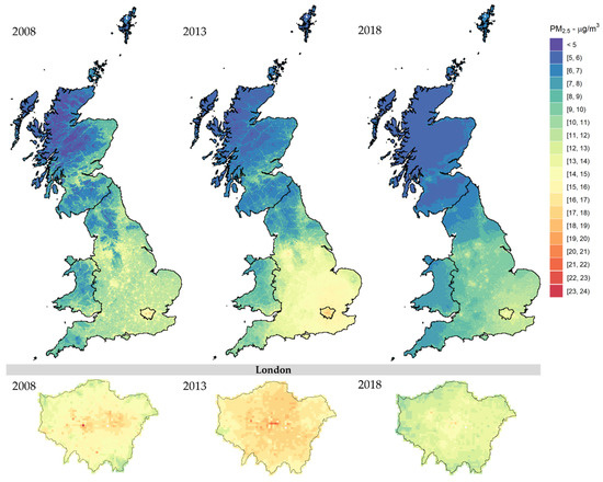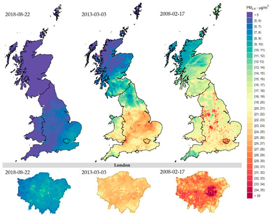 In 2008, a new Air Quality Directive came into force, bringing considerable changes to the following UK annual air quality assessments in 2010, setting an annual mean target of 25 µg/m3 [51]. Several policy controls and emission reductions had been put in place aiming to reduce from 2010 the road traffic PM emission by 83%, off-road mobile machinery by 54%, and energy production by 32% until 2020 [52]. Independently of the temporal aggregation (daily or annual), all maps shown in this study detected this considerable drop in the PM2.5 concentrations from 2010 across Great Britain.