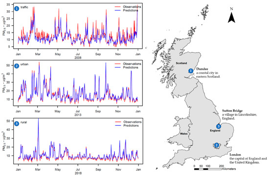 Stage-4 daily series of observed and predicted PM2.5 values across Great Britain for 2008, 2013, and 2018: (1) Traffic monitor—located in Dundee (Scotland); (2) Urban monitor—located in London (England); and (3) Rural monitor—located in Sutton Bridge (England).