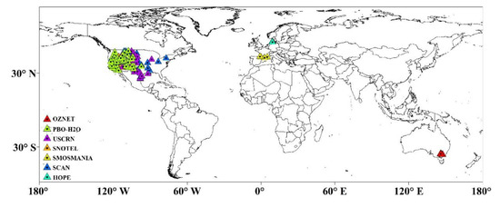 The ground SM measurements from various networks of the international soil moisture network (ISMN) were used to evaluate the performance of merged and parents SM products. The locations of ISMN ground stations used in this study are displayed in Figure 1.