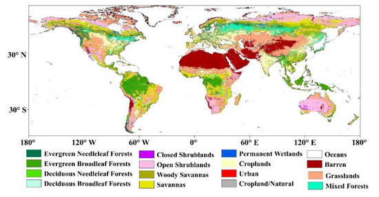 The quality of SM data from both satellite and land surface model changes according to land cover types [14,57]. In this study, The MODIS (Moderate Resolution Imaging Spectroradiometer) land cover product (MCD12Q1) with grid resolution 0.5 km was used to assess the performance of merged and parents SM products over different land covers on a global scale. MCD12Q1 product provides a yearly land cover on a global scale from 2001 to the present available freely for users through (https://search.earthdata.nasa.gov/) [58]. Figure 2 shows a global map of the MODIS land cover.