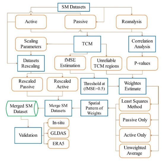 A flowchart of the proposed blending scheme of SM datasets is shown in Figure 3. The blending scheme is based on maximizing signal to noise ratios. The fractional mean-squared-error (fMSE) estimates derived by the TCM was used for weight estimation based on the least-squares method. The proposed scheme was applied by using a threshold between signal and noise at fMSE equal to 0.5 to maintain the high-quality SM observations. Based on the correlations determinations between all three SM datasets of TCM at significance levels (i.e., p-values), we proposed four scenarios in the regions of unreliable TCM. These scenarios include using passive SM product only or using an active SM dataset only or using an unweighted average or exclude the pixels without any retrieval skills. The proposed merge scheme was applied to SM retrievals from ASCAT, SMAP, and AMSR2 in the period from June 2015 to December 2017 to produce SMAP+ASCAT and AMSR2+ASCAT SM datasets. The two merged SM datasets were evaluated against SM estimates from in situ observations of ISMN and reanalysis datasets (GLDAS and ERA5). More details about the merging scheme in the following sub-sections.