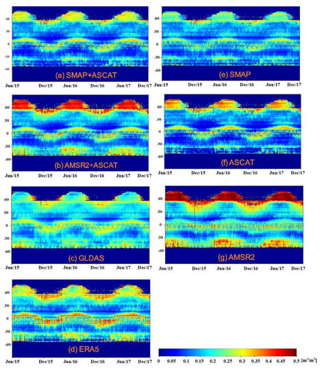 Hovmöller diagrams of merged and parents SM datasets in the period from June 2015 to December 2017: (a) SMAP+ASCAT; (b) AMSR2+ASCAT; (c) GLDAS; (d) ERA5; (e) SMAP; (f) ASCAT; and (g) AMSR2.