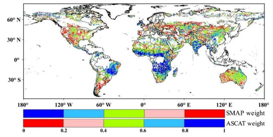 The spatial distribution of the global optimal weights for parent SM products (SMAP and ASCAT) of the SMAP+ASCAT merged dataset.