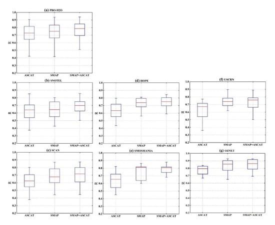 Box plots of correlation coefficients of SMAP+ASCAT, SMAP, and ASCAT SM products against the in-situ SM observations of different ISMN networks: (a) PBO-H2O; (b) SNOTEL; (c) SCAN; (d) HOPE; (e) SMOSMANIA; (f) USCRN; and (g) OZNET.