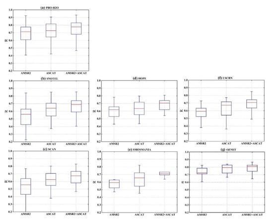 Box plots of correlation coefficients of AMSR2+ASCAT, AMSR2, and ASCAT SM datasets against the in-situ SM observations of different ISMN networks: (a) PBO-H2O; (b) SNOTEL; (c) SCAN; (d) HOPE; (e) SMOSMANIA; (f) USCRN; and (g) OZNET.