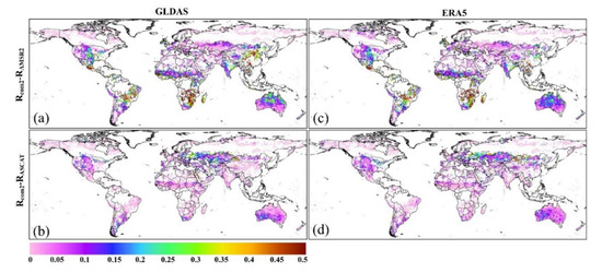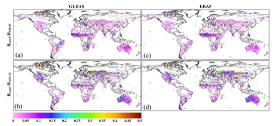 Although, SM measurements of ground stations consider more robust reliable methods to assess the performance of the satellite SM retrieval data, but still has limitations in the temporal and spatial coverage all over the world. Also, the ground observations have some challenges due to mismatches between it and the footprints from large scale satellite measurements and the limitations of spatial coverage [40,41,42]. Therefore, to overcome these problems and fully evaluate the merged and parents SM datasets over different land covers, the comparison with reanalysis becomes the alternative solution. The merged and parents SM products were assessed by comparing it with GLDAS and ERA5 reanalysis datasets using R and RMSE metrics. The spatial distribution of differences in correlation coefficients (against modeling datasets) between merged (SMAP+ASCAT and AMSR+ASCAT) and parents (SMAP, AMSR2, and ASCAT) SM datasets are displayed in Figure 9 and Figure 10.