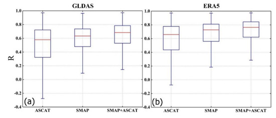 Box plots of correlation coefficients of merged (SMPA+ASCAT) and parent (SMAP and ASCAT) SM datasets against the modeling SM products (GLDAS and ERA5): (a) GLDAS; and (b) ERA5.