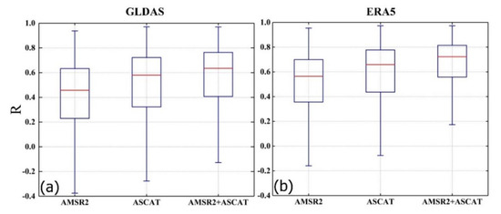 The SMAP+ASCAT and AMSR2+ASCAT are achieved improvement in temporal correlations coefficients with GLDAS and ERA5 outperforming the parents datasets overall the world. These correlations improvements spatially distributed over different land cover types of all most areas of the world according to the spatial weights patterns of parents’ datasets. Over more dense vegetation regions (forests, savannas, and crops) the SMAP and AMSR2 are displayed high R differences with their merged datasets. Over these areas, the SMAP and AMSR2 were given the lower relative weights than ASCAT products for merged products. Conversely, over moderate and less vegetation regions (grassland, shrub, and desert) the ASCAT showed high R differences than their merged products. Over these regions the ASCAT was given the lowest relative weights than SMAP and AMSR2 products in their merged products. Although, the GLDAS is used as one of three datasets of TCM to calculate fMSE however the SMAP+ASCAT and AMSR2+ASCAT SM products showed better performance with ERA5 exceeds the performance with GLDAS. Box plots of correlation coefficients of merged and parents SM datasets against the modeling SM products are presented in Figure 11 and Figure 12.
