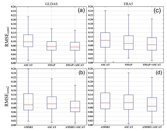 Although, the GLDAS is used as an item in three datasets of TCM to calculate fMSE, the SMAP+ASCAT and AMSR2+ASCAT products showed better performance with ERA5 exceeds the performance with GLDAS, which provides evidence about the independently of merged datasets. In recent studies [48,49,57], the different generations of commonly used global model products were evaluated with observations on global and regional scales. The results showed that the ERA5 atmospheric reanalysis outperforms other models by achieving a high correlation and less RMSE with ground measurements. Therefore, the high correlation of merged SM datasets with ERA5 gives an advantage for the proposed scheme.