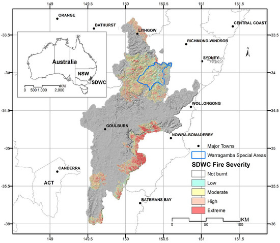 The 2019–2020 fires have severely and extensively burnt major forests within the drinking water catchments for Sydney, about 30% of SDWC areas have been burnt, and 16% of them are in high or extreme severity based on the fire extent and severity mapping (FESM) [23]. The fires were more severe near the Warragamba Dam, where about 81% of designated Special Areas burned (areas with little to no public access), with 30% at high to extreme fire severities (Figure 1). These drinking water catchments are managed by Water New South Wales (WaterNSW) and the New South Wales Department of Planning, Industry and Environment (DPIE).