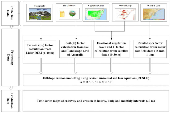 Hillslope erosion (including sheet and rill erosion) is the major form of water erosion and the dominant source of sediment in waterways in Australia and many parts of the world [5,6,7]. Monitoring of hillslope erosion after wildfires may be by direct measurement, such as flumes and sediment traps, or from tipping bucket sampling techniques. However, these techniques are commonly expensive, episodic, and impractical to apply across a large catchment. Observers with different levels of expertise make it difficult to consistently measure or predict long-term soil loss or erosion risk. A common model and consistent datasets are required for reliable soil loss prediction to provide consistent and continuous erosion information for short- and long-term soil and water quality management [5,6,7].