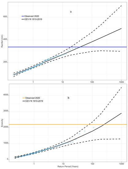 The return periods for the 2019–2020 post-fire in the Sydney drinking water catchment area: (a) Rainfall; (b) rainfall erosivity. The circles indicate return periods for the annual maximum rainfall based on the 1910–2019 climate; the dash lines are the corresponding ± 1.96 × standard error at the 95% confidence level.