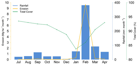 Figure 4 shows the impacts of total vegetation cover and rainfall on erosion at SDWC for the 2019-20 wildfire period. The sharp increase in the erosion rate in February (Mg ha−1 month−1) reflects the combined impacts of wildfire and rainfall on erosion and their relationships.