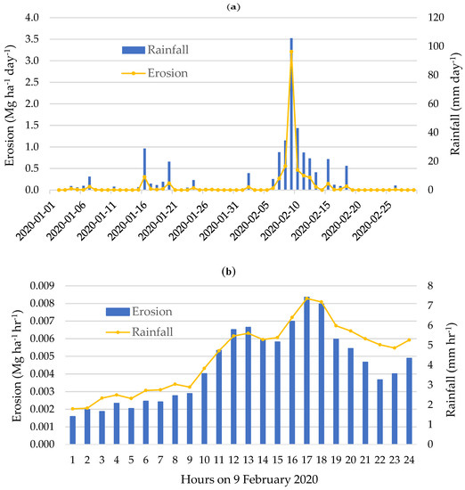 Estimated erosion rate from radar Rainfields data in January and February 2020 at: (a) daily step; (b) hourly step on 9 February 2020.