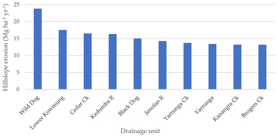 Figure 7 further presents the 10 drainage units with the highest erosion rates over the SDWC area after the 2019–2020 wildfires and storm events in February 2020. The erosion rates range from 13.2 Mg ha−1 month−1 in Brogers Ck (ID = 24) to 23.8 Mg ha−1 month−1 in Wild Dog (ID = 193), much higher than the average annual rate in NSW. Linking erosion risk information with these drainage units (the smallest water management units) helps the water management agency (i.e., WaterNSW) to prioritize the monitoring and mitigation actions.