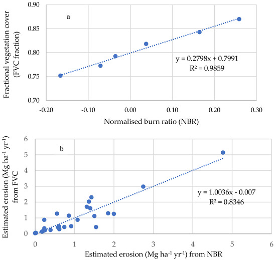 Relationships of fractional vegetation cover (FVC) estimated from MODIS and normalized burn ration (NBR) from Sentinel-2: (a) FVC and NBR relationship; (b) estimated erosion rates using FVC and NBR.