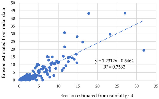 Figure 9 compares the rainfall erosivity and the final erosion estimation from the BoM daily rainfall gridded data (5 km) and the radar Rainfields data (15 min, 1 km). Though the source datasets are very different in resolution and measurement, there is a high correlation between them (R2 = 0.7562), implying that the radar Rainfileds data can be directly used in estimating erosivity.