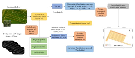 When inspecting the quality of hyperspectral images, the first nine bands and the last 15 bands of each image were excluded because they were found to have been affected by noise during the post-process. Then, a number of features, including original spectral bands, vegetation indexes, and texture features, were extracted from these hyperspectral images.