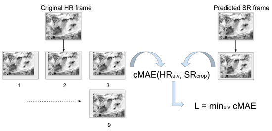 cMAE. For each possible pixel shift u,v, the cMAE is calculated between the cropped SR and the patch. In this example figure, the maximum possible shift is 1 (both horizontally and vertically), so 9 patches are extracted for each possible combination. The PROBA-V dataset has a maximum of 3 pixel shifts, so 49 combinations are needed to calculate the final loss.