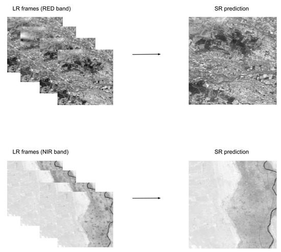 The problem of Super Resolution (SR) is not new. It has been widely studied in different contexts taking multiple approaches. Specifically, to improve the resolution of satellite images, one common approach is the use of Discrete Wavelet Transforms (DWTs), in which the input image is decomposed into different sub-bands and then combined to generate a new resolution through the use of inverse DWTs [11,12,13]. In recent years, as deep learning applications explode in every computer-vision task, convolutional neural network methods began to dominate the problem of SR. However, most of them focus on Single-Image Super Resolution (SISR) [14,15,16] and do not take advantage of the temporal information inherent to multi-frame tasks. MFSR has been studied in video; for example, Sajjadi et al. [17] proposed a framework that uses the previously inferred HR estimate to super resolve the subsequent frame; Jo et al. [18] created an end-to-end deep neural network that generates dynamic upsampling filters and a residual image avoiding explicit motion compensation; and Kim et al. [19] presented 3DSRnet, a framework that maintains the temporal depth of spatio-temporal feature maps to capture nonlinear characteristics between low- and high-resolution frames. Regarding the deep learning approaches to MFSR in satellite imagery, recent work has demonstrated its applicability: Märtens et al. [20] proposed a CNN, capable of coping with changes in illumination and cloud artifacts, that was applied to multi-frame images taken over successive satellite passages over the same region. Molini et al. [21] implemented a method that exploits both spatial and temporal correlations to combine multiple images, and Deudon et al. [22] created an end-to-end deep neural network that encodes, fuses multiple frames, and finally, decodes an SR image.