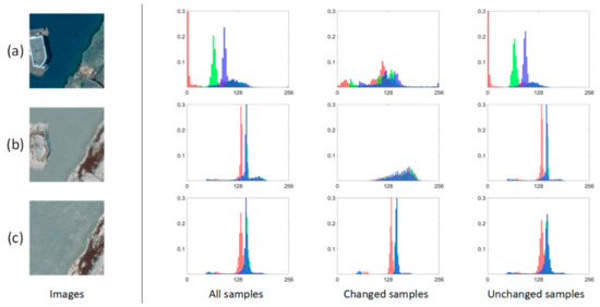 Change detection task is mainly concerned with the identification and quantitative analyses of the changes of land cover types from co-registered bi-temporal remote sensing images and . Although and are acquired in the same area, various positions, imaging conditions, atmospheric conditions, and even phenological shifts may lead to the spectral variation of the same land cover type between bi-temporal images. The land cover samples in these two images distribute dissimilarly and irregularly in the chromatic space, no matter changed or unchanged ones they are, as illustrated in Figure 1a,c. Remarkably, both the changed and unchanged samples have completely diverse distributions on the multi-channel histograms, making it difficult to detect changes using a simple decision-making strategy, or an end-to-end deep learning model. In order to highlight the features of the real changes between co-registered images and suppress interference of the spectral discrepancies of the same land cover types, a ConvLSTM network and a cGAN model are integrated to form a domain translation framework, to distill the land cover knowledge from the pre-event images, thereafter, progressively adjust the distributions of seasonal style features from the original domain to post-event one in the chromatic space, as illustrated in Figure 1b,c. At this stage, all the land cover samples follow an analogous distribution on the multi-channel histograms, where the changed ones appear diverse while the unchanged ones remain consistent. In this way, the changed and unchanged regions can be significantly differentiated by directly comparing the paired translated and post-event images, or by using a simple decision-making strategy.