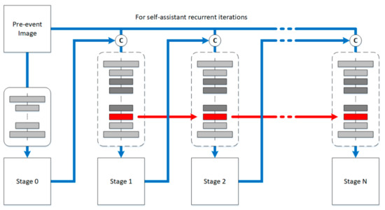 Given a pre-event image as the input of this module, the initial processor produces a feature map as the primal guidance image for later image translation. For the entire translation process, this feature map can be regarded as the translated image at stage 0, defined as , its size is identical to those of the input image. Thereafter, taking the pre-event image as the self-assistant criteria, the image translator recurrently processes the concatenation of the pre-event and translated images as an image sequence, where multiple images can be regarded as the stage 1 to of the progressive translation process, as defined in Equation (4).