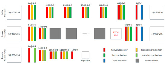 Network architectures of the initial processor, image translator, and domain discriminator.