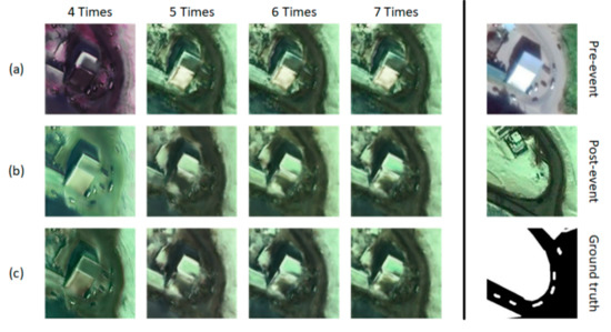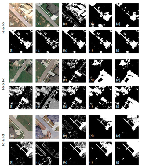 The second type of dataset includes 3 couples of bi-temporal remote sensing images with major seasonal variation. As shown in Figure 7, in this dataset, the former two image pairs have the same dimension as ones in dataset I, with different spatial resolutions of approximate 0.22 and 0.52 m per pixel, and the latter image pair has the dimension of , with the spatial resolution of approximate 0.5 m per pixel. Compared with those in dataset I, the changes in dataset II include more roads and vehicles, but fewer vegetation covers. In the training process, different from dataset I, we suggest regarding the images without snow cover as the pre-event images and regarding the images with snow cover as the post-event images.