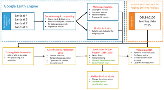Since the opening of the Landsat archive to the public, the number of land cover studies using these data products has increased significantly [40]. In this study, we use Collection 1 Tier 1 surface reflectance data of Landsat 4, 5, 7, and 8 for the period 1984–2015 provided by the United States Geological Survey (USGS) and available on the Google Earth Engine [41]. This Landsat archive was processed to a Level-1 precision, terrain- and atmospherically-corrected product, while cloudy and cloud shadow pixels were flagged by the internal C Function of Mask (CFMASK) algorithm. Several pre-processing steps were executed on the data (see also Figure 2). Firstly, the differences in sensor characteristics between Landsat satellites were corrected following the strategy of Roy et al. [42]. Secondly, by using the spectral information of Landsat, several vegetation indices were calculated (a full list can be found in Appendix A). For each of these spectral bands and indices, descriptive metrics (mean, median, 10th and 90th percentile, and the 10th–90th percentile range), harmonic metrics based on the Harmonic ANalysis of Time Series (HANTS) algorithm using a Fourier transformation [43], textural metrics (the uniformity of a pixel compared to its neighbors), and topographic metrics are calculated and used as the input for our classification algorithm [24]; see also Appendix A. In order to obtain correct harmonic metrics, all calculations were performed on three year epochs (e.g., calculations for 2015 include data from 2014–2016). Lastly, a data quality indicator was calculated based on the amount of cloud-free satellite overpasses for each of the time periods (Figure 2).