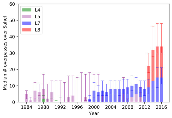 Median cloud-free Landsat overpass amounts per pixel over the Sudano-Sahel study area. The error bars indicate the spatial variability (10th–90th percentile).