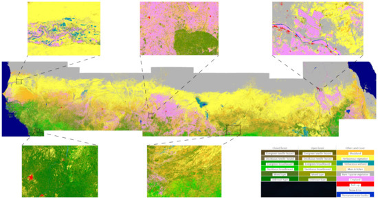 Discrete land cover classification at 30 m for the Sudano-Sahel for 2015, including several high resolution insets.
