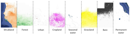 A statistical analysis of the accuracy of the discrete land cover map is provided. An area-weighed (proportional to the total mapped area) overall accuracy of 68% and Cohen’s Kappa value of 59% are achieved (Table 2). Highest confusion is caused by the high similarities in the spectral signature of forest and shrubland on the one hand and shrubland and grassland on the other hand at the transition of eco-zones. A relatively high disagreement between these classes is found here, which is expected as the shrubland class is in reality a mixed composition of grassland and trees. This reflects the heterogeneity within a 30 m × 30 m pixel in the complex Sudano-Sahel ecosystem [57]. It is noted that when accommodating for spectral similarities between neighboring classes (forest and shrubland on the one hand and shrubland and grassland on the other hand), the overall accuracy of the map increases to 83%, while Cohen’s Kappa value attains 78% (Table 2; numbers in parentheses). The accuracy of bare, cropland, and wetland is above average, while for water and urban, it is generally below average. It must be noted that water and built-up surfaces are mainly fused in from external datasets (see Section 2.3). Since accuracy is weighed based on the area of each class, a very low users’ accuracy is obtained for built-up surfaces.