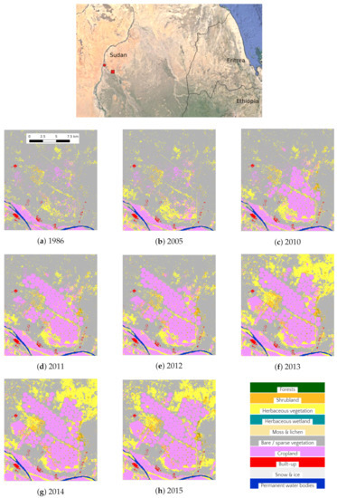 The results above show the capability of our land cover maps to detect several land cover changes in the last 30 years over broad regions or at the country level. Yet, since our product is available at 30 m resolution, it is also important that small details and fine-scale changes are captured correctly. One form of land cover change at the fine-scale level is cropland expansion in the form of crop circles near the Nile river in Sudan. An example is provided for a small location southeast of the city of Khartoum (Figure 7). These irrigation circles have been constructed since 2005 and are expanding over time, with a broad expansion in 2011 and a gradual increase in the period 2011–2015. Thanks to the yearly maps present between 2010 and 2015, the timing of the cropland growth can be captured in high detail both on the temporal and spatial scale. This example shows the capability of our land cover maps to discriminate not only broad-scale land cover changes, but also very detailed and fine-scale variability, which is a large added value to the community studying the Sudano-Sahel region.