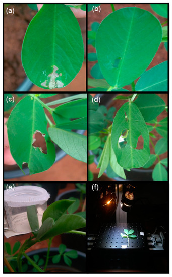 Natural defoliation was performed 30 DAE based on the methodology of Delaney et al. [33]. Leaf cages composed of transparent plastic cylinders (6 cm in height × 4 cm in diameter) were used to restrict larvae to a single freshly opened leaflet and each cage was sealed with cardboard (5 × 5 cm in diameter) (Figure 1e). The same leaf position was adopted for all treatments. All larvae were removed after 24 h, while primary-leaf photosynthetic measurements were recorded 24 and 48 h after herbivores were introduced. The simulated herbivory (Figure 1b,d) was carried out by removing part of the peanut leaflet corresponding to the injury observed in the natural defoliation caused by the larvae. This simulated larval defoliation was performed after the removal of leaf cages with the aid of scissors in the same position as the injury caused by both S. bosqueella and S. cosmioides (Figure 1a,c). In addition, control plants were used for all treatments. All treatments received leaf cages to control for any cage-effects on the experiments.