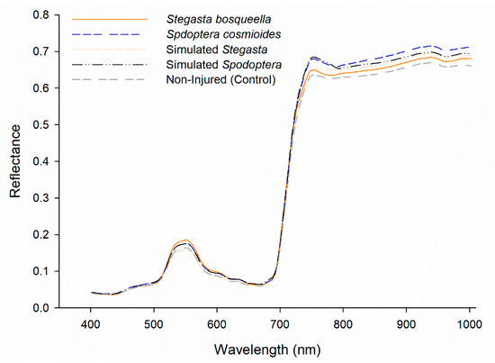 Similarly, ANOVA F-values analysis suggested that the NIR spectral data can be used to detect stress between S. bosqueella, S. cosmioides, and non-infested leaves. The importance of the NIR portion of the spectrum in characterizing biotic stress caused by defoliators was reported by Huang et al. [46] in rice leaves injured by Cnaphalocrocis medinalis (Lepidoptera: Crambidae) and Sudbrink et al. [47] in cotton (Gossypium hirsutum) injured by Spodoptera exigua and Trichoplusia ni (Lepidoptera: Noctuidae). Our finding is an important one because a wide variety of vegetation indices combine reflectance data in the NIR region to detect biotic stress, including, for example, the Normalized Difference Vegetation Index (NDVI) and the Green Normalized Difference Vegetation Index (GNDVI) [48].
