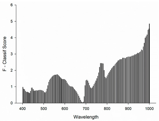 We verified that the average reference spectral signature for the different treatment groups illustrated the spectral regions that were crucial in their distinction and classification with low standard deviation (Figure 2, Figure S1). The reflectance profiles for each of the treatment groups appeared to be similar in the visible wavelengths, although spectral deviations occurred above 700 nm in the near-infrared (NIR) region. The spectral profile for control leaves exhibited the lowest values between 777.42–1000 nm, in contrast to an increase in reflectance in the stressed treatment classes. We also observed that the stressed classes based on the actual injury corresponding to each larval species exhibited different spectral responses in the NIR region. However, the simulated injury appeared to be similar to the injury made by the real larvae. Furthermore, the variable importance plot based on ANOVA F-values scores confirmed that the 777.42–1000 nm portion of the spectrum was crucial for spectral distinction among treatment groups (Figure 3).