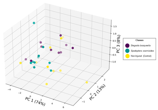 Figure 4. Principal component analysis representation of spectral reflectance data deriving from larvae stressed and non-injured peanut leaves.