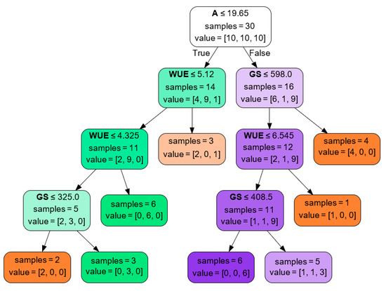 Figure 5. Classification tree for Stegasta bosqueella (orange), Spodoptera cosmioides (green), and non-injured (purple) leaf injury based on gas exchange parameters. A-assimilation/respiration (μmol CO2 m−2 s−1); GS-stomatal conductance (mmol H2O m−2 s−1); WUE-photosynthetic water use efficiency (mmol CO2 mol−1 H2O).