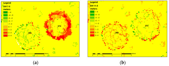 Comparison of two selected tree heights (maximum height value in raster cell from 3D point cloud) displaying raster of 10 cm·pixel differences of two flights where tree 265 was not detected to have bending branches and tree 273 was detected to have bending branches: (a) Difference between summer and spring flight; raster values around tree 273 are red cells with positive values showing the difference in crown structure (e.g., bent branches); (b) Difference between spring and autumn flights; cell values around tree 273 show no difference, as the branches have returned to their spring positions.
