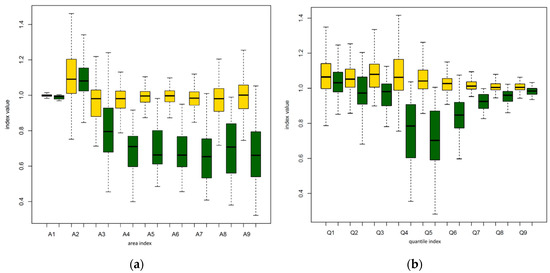 Boxplots for calculated areas (a) and quantiles (b) along tree lengths; yellow bars represent trees with no bending branches, and green bars represent dead trees with evidence of bending branches. On horizontal axis are described the names of used metrics and on the vertical axis are index values.