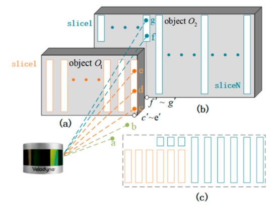 We defined that a slice is a point set containing the points firing on the same object and within the same vertical block. Figure 2 shows the schematic diagram of LiDAR slices, where points a and b are the points firing on the ground by LiDAR; points c, d, e are the points firing on O1, forming a slice of O1; points f, g are the points firing on O2, forming a slice of O2; points c′, d′, e′ and f′, g′ are the points after the projection of points c, d, e and f, g to the horizontal plane, respectively. In fact, a certain object can be represented by several slices in the same vertical plane, as shown in Figure 2a,b. The vertical plane contains all objects’ slices, which are in the same direction, as shown in Figure 2c.