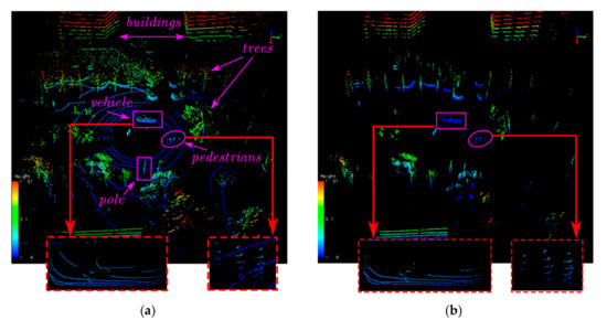 The results of semantic segmentation. (a) Original point cloud, where color means the height of points; (b) The results of semantic segmentation, where green objects belong to plants, violet objects belong to buildings, blue objects belong to the road users, and the red objects belong to poles.