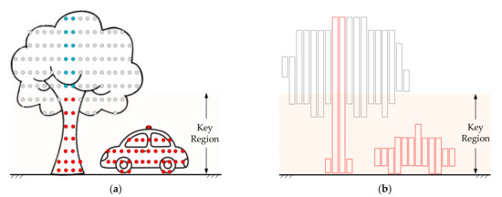 From Figure 3a, it can be seen that a raw point cloud contains a lot of objects, such as road users, roads, and plants. Trees are the most special because the distance between its major part (trunk) and the additional part (leaves) can be very far, and the area covered by the additional part is higher than that of the major part. However, no matter moving road users or the fixed tree trunks, their major parts are all close or connected to the ground, which is different from the leaves. Therefore, a height Hmp can be set to find the major part of the object and exclude the leaves as much as possible. We call the area between the ground and height Hmp as the key region.