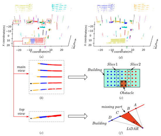 Figure 9b,c show the top main view and the top view of the building in the bottom of Figure 9a, respectively. The main part of this building is divided into four parts due to the occlusion of the objects in front of it. In this paper, we only consider a small part of the occlusion. Otherwise, too much information will be lost for the occluded objects. Figure 9e is a schematic diagram of the main view of the obscured building, where the building is divided by the obstacle into two parts—the blue part and the red part. Moreover, those parts should belong to the same object. Therefore, the nearest two complete slices, such as slice 1 and slice 2 in Figure 9e, are similar to each other. We use the number of points in a slice to measure the similarity between the two adjacent slices, then,